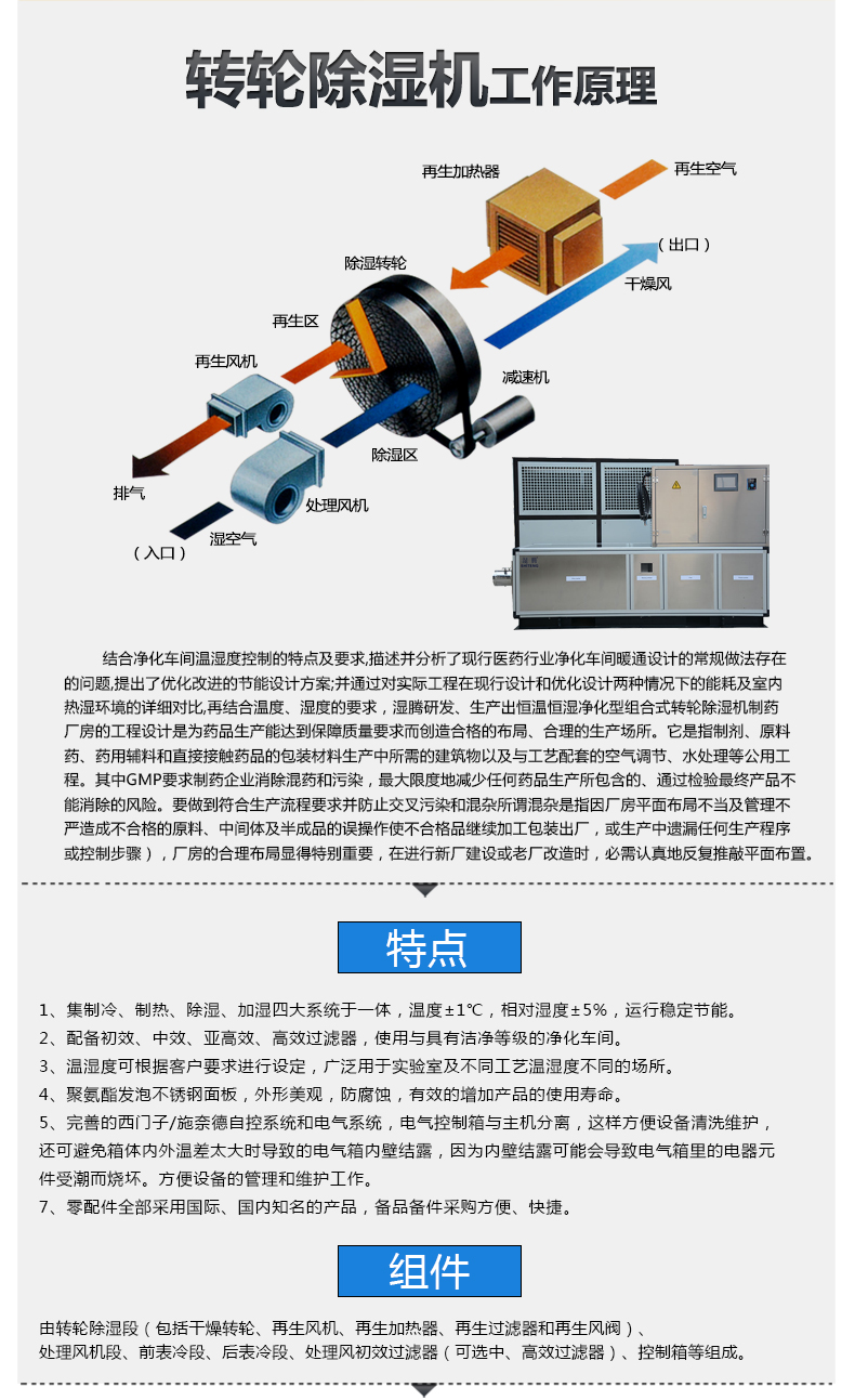 結合凈化車間溫濕度控制的特點及要求,描述并分析了現行醫藥行業凈化車間暖通設計的常規做法存在的問題,提出了優化改進的節能設計方案;并通過對實際工程在現行設計和優化設計兩種情況下的能耗及室內熱濕環境的詳細對比,再結合溫度、濕度的要求,濕騰研發、生產出恒溫恒濕凈化型組合式轉輪除濕機。